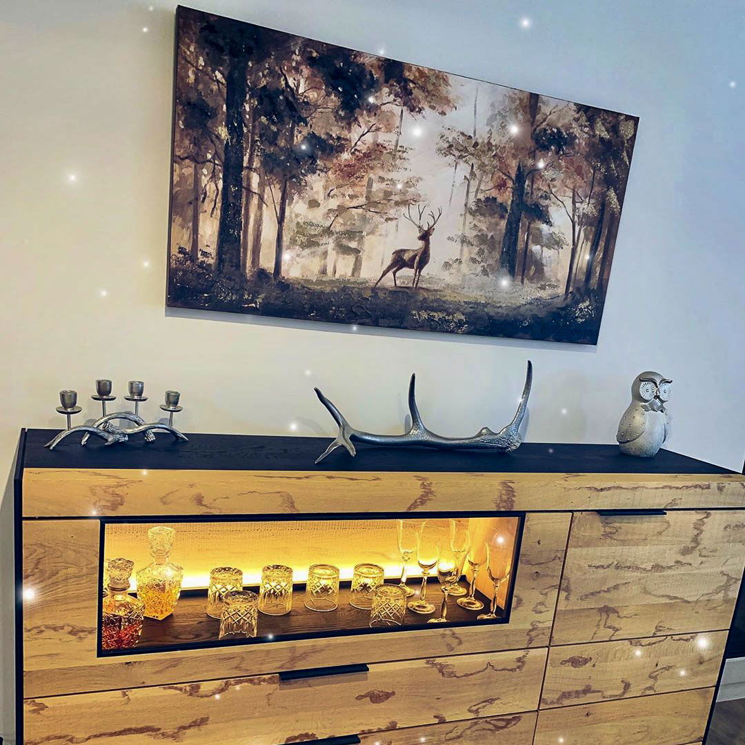 Der Hirsch auf dem Ölbild 'Stag in the Brume' sticht auf der hellen Lichtung inmitten des braun gehaltenen Waldes sofort ins Auge. Sowohl das Tier als auch die Bäume sind mit Glitter verziert und funkeln reizvoll im Licht. Holen Sie die Natur in Ihr Wohnzimmer oder beeindrucken Sie die Gäste in Ihrem Büro mit diesem handgemalten Gemälde. Ihr handgemaltes Gemälde erhalten Sie in der Größe 120x60cm. Anders als bei minderwertigen Drucken auf Leinwand können Sie auf unseren Unikaten jeden Pinselstrich fühlen. 0 Oil painting 1 Ölgemälde Handmade Quality 2 2