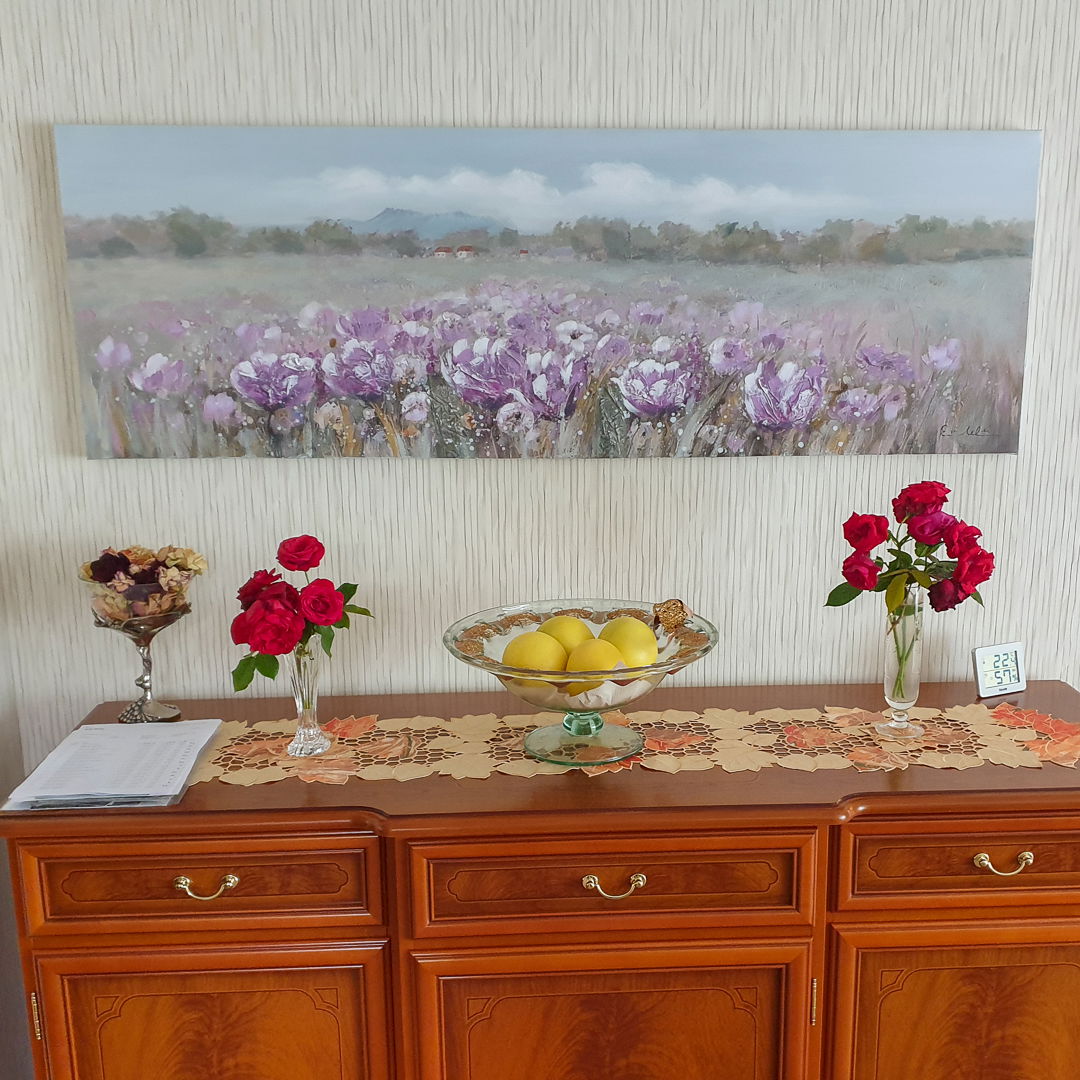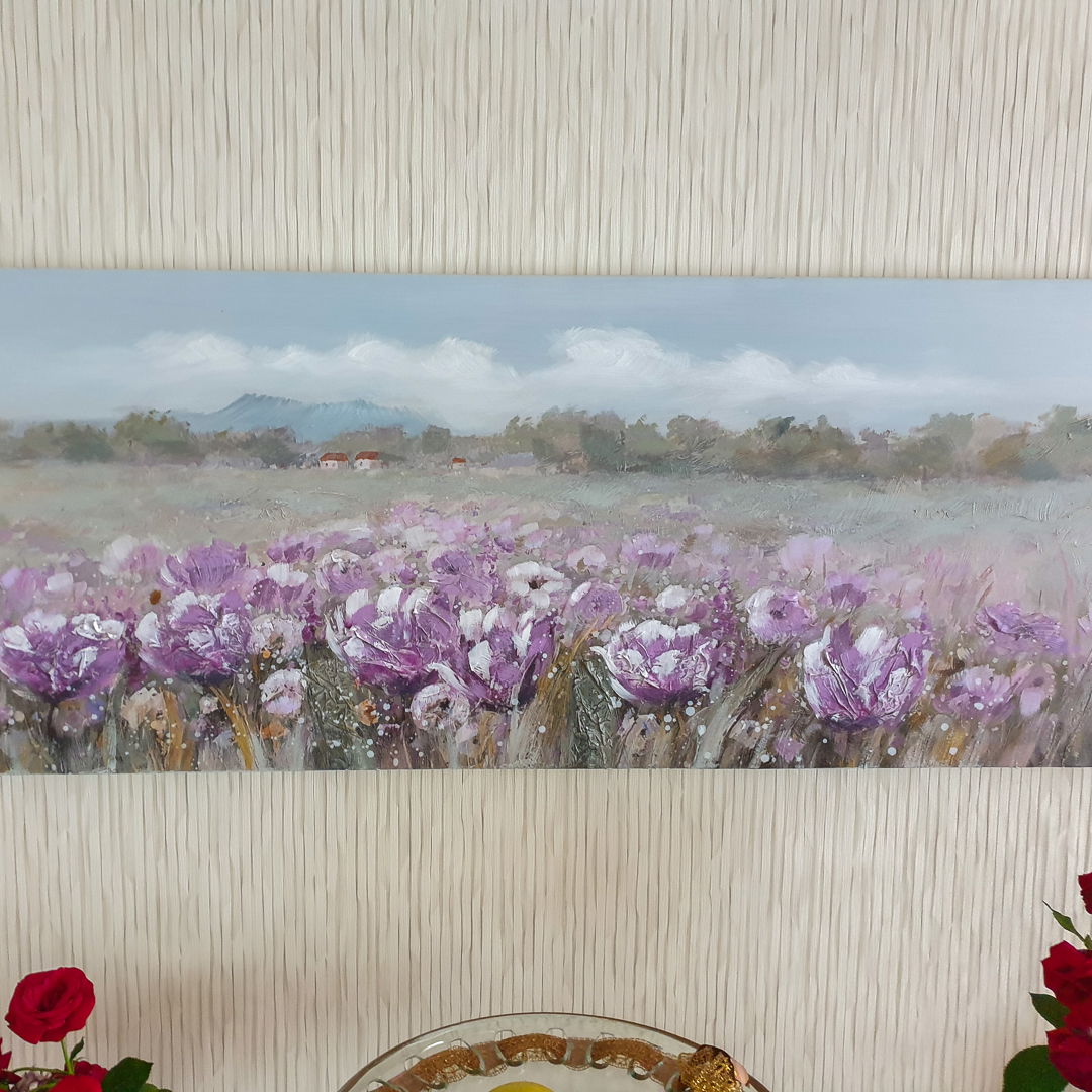 Ein 'Blühender Sommer' schmückt auf dem handgemalten Ölbild grüne Wiesen mit einem Meer aus Blüten in sanftem Lila. Auf stilvolle Weise versetzt Sie das mit Mixed-Media-Elementen und Glitter verzierte Gemälde in Gedanken sofort in die warme Jahreszeit. Schmücken Sie Ihr Wohnzimmer mit einem stilvollen Kunstwerk, das überzeugt. Ihr handgemaltes Gemälde erhalten Sie in der Größe 150x50cm. Anders als bei minderwertigen Drucken auf Leinwand können Sie auf unseren Unikaten jeden Pinselstrich fühlen. 0 Oil painting 1 Ölgemälde Handmade Quality 2 2